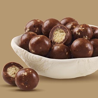 ライトな食感が楽しめるクリスピーシリアルを、ヘーゼルナッツプラリネと合わせたミルクキャラメルチョコレートでコーティング。